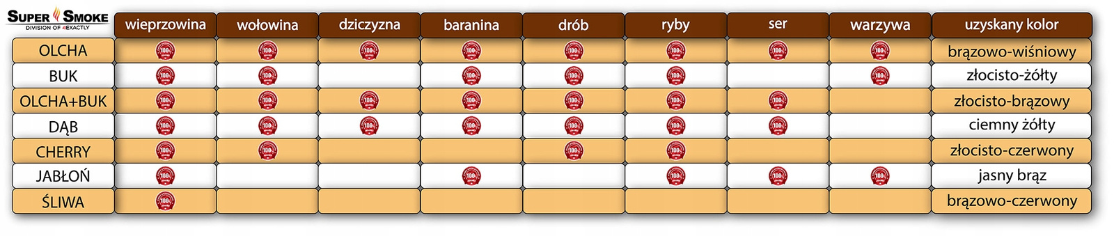 Aby wybrać najlepszy rodzaj drewna do używanego mięsa/produktu – można odnieść się do informacji zawartych w tabeli poniżej.